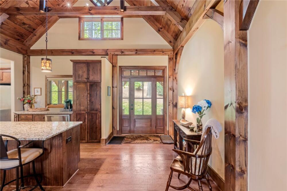 Location! Location! Location! Pre-inspected 5 bedroom, 6.5 bath Mill Creek Post & Beam craftsman home! Rare opportunity! Walkable to all the amenities! Enjoy the unique and highly desirable pond view with custom beams, cathedral ceilings and impressive woodworking throughout! The Great Room has a stacked stone fireplace and access to deck with lovely screened in porch and gas log fireplace. Remodeled to improve flow and usability, the kitchen now offers increased space and functionality with built in coffee bar and warming drawer. The main level also includes a spacious master suite, guest ensuite and an additional full bath. The TERRACE LEVEL includes two bedrooms (one ensuite), full bath, laundry room, and rec room with built-in bar/barstool seating. Walk out the back door to enjoy peaceful access to the pond. The property includes a standalone two-car garage with a guest suite, full bath and flex room. There is a path along the side of the home that will take you directly to your covered golf cart garage for easy storage and access. Generator, Trex decking, Lower level HVAC replaced 2025. The Reserve at Lake Keowee offers a Jack Nicklaus Signature Golf Course, a par 3 practice facility with driving range and outdoor bar, Clubhouse with fine dining, pub area and wine bar, Fitness Center, Hiking Trails, 4 Har-Tru Clay Tennis Courts, Lakeside Resort-Style Pool and Cabana, Settlement Pool, 8 Pickleball Courts, Marina offering both slips and boat rentals, and Market great for lunch and select provisions. This gated community offers many activities including fitness classes, various social clubs, and a high-speed fiber-optic internet system in place. The Reserve at Lake Keowee is a full amenity lakefront golf community. Premier membership deposit is $100,000. The seller is willing to sell turnkey/furnished. Advance notice required.