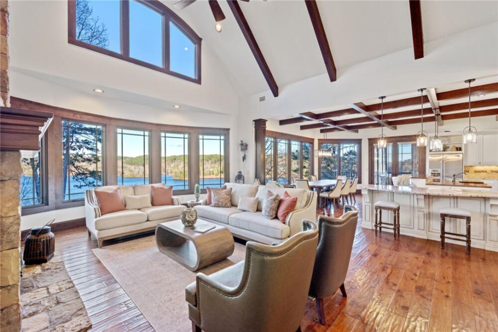 Experience the pinnacle of waterfront living in this custom-built masterpiece, perfectly positioned to capture northern panoramic views of Lake Keowee and the Blue Ridge Mountains. From the moment you enter, floor-to-ceiling glass windows draw your eye to the water, framing a landscape that feels like a living work of art. The heart of the home is a vaulted Great Room featuring hand-hewn wooden beams and a cozy gas fireplace. This space flows effortlessly into a Chef's kitchen designed for both function and scenery. Just off the kitchen, a massive EZ Breeze screened-in porch with a gas burning fireplace offers the ultimate retreat for morning coffee or sunrise relaxation. The primary master suite serves as a private sanctuary, boasting vaulted ceilings and sweeping lake vistas. The lower level is a true entertainment hub, featuring a sprawling recreation room with space for billiards, a fully equipped bar and kitchenette (complete with beverage cooler and refrigerator), and a dedicated home gym or office. This level also includes an ensuite bedroom, an additional guest room, and a second laundry room—all with stunning lake views. Above the oversized garage and workshop and above the garage you can have private guest retreat with a full bath provides an ideal secluded space for visitors or a quiet home office. An expansive covered patio with wood burning fireplace and outdoor patio with fire pit that has gas starter lead directly to the private dock, making lake access seamless. Equipped with a generator, an elevator shaft for future accessibility, and a dedicated lower-level golf cart garage. The Cliffs at Keowee Falls residents enjoy 2,500 private acres, including an award-winning Jack Nicklaus Signature golf course, a state-of-the-art wellness campus, hiking trails, tennis/pickleball courts, and fine dining at the clubhouse. This property is available with a furnished option and boat & jet ski for those seeking an immediate move-in and lake enjoyment. Showings require 12-hour notice; listing agent must be present. Discover more about the community at The Cliffs at Keowee Falls South.